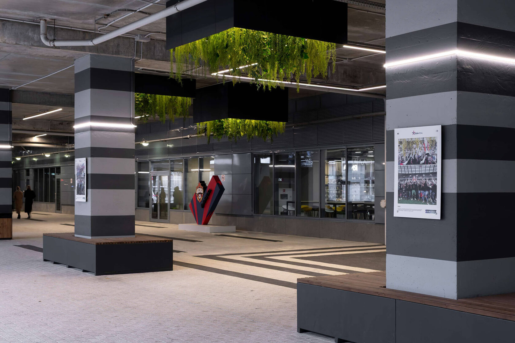 Индивидуальные подвесные клумбы на стилобате с декоративным озеленением и освещением закреплены в стилобат нижнего яруса стадиона. Внутри конструкции потребовалась точная координация элементов: озеленение размещено на подвесной сетке, приваренной к основному каркасу, с интеграцией освещения.